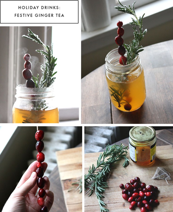 Here’s a non-alcoholic holiday-themed drink recipe that is perfect for warming you up on those cold, winter days. Based on this recipe, all you have to do is bring two cups of water to boil, add a bag of ginger tea, and pour in a little bit of honey. Let the tea steep for a while, remove the tea bag, and then transfer to your mug of choice (if using a mason jar remember to add a sleeve – the glass will get very hot). Add in a skewer of fresh cranberries and a sugared sprig of rosemary and you’re done! To sugar the sprig of rosemary simply wet the rosemary sprig, shake off excess water, and lightly coat in sugar. Quite possibly the easiest holiday recipe you’ll make this season!