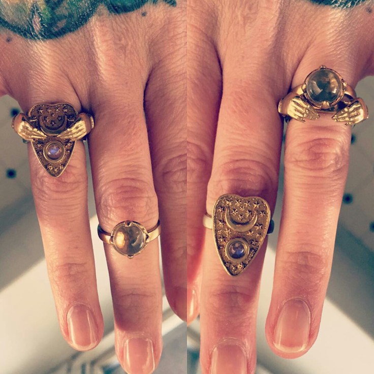 Occultist stacking ring set in brass with rainbow moonstone and quartz sphere. You can wear them in so many different ways!