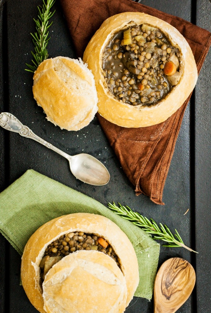Lentil, mushroom and veggie sausage in bread bowls / Recipe