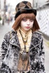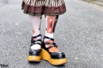 TiruObake on the street in Harajuku wearing a resale faux fur coat over a Kiki-Rara Shoten corset, Dangerous Nude striped drawers, graphic socks, and Miho Matsuda platform shoes. Full Look