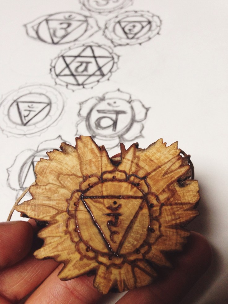 Wood burning chakra art onto sacred palo santo pendants. Wood from Ecuador. Jah bless.