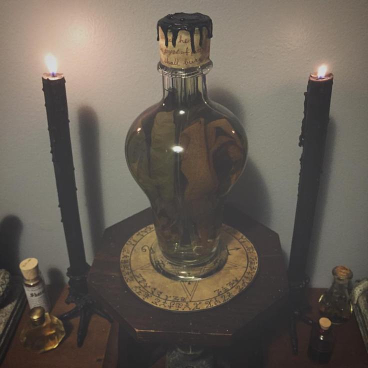 Several years ago I stumbled upon a unique bottle that was divided into four chambers. After throughly cleansing it and consecrating it, I crafted an aqueous reliquary for four baneful plants which stand as ally and teacher to the witch. Belladonna, Digitalis, Datura, and Aconite stand as guardian and companion here.
