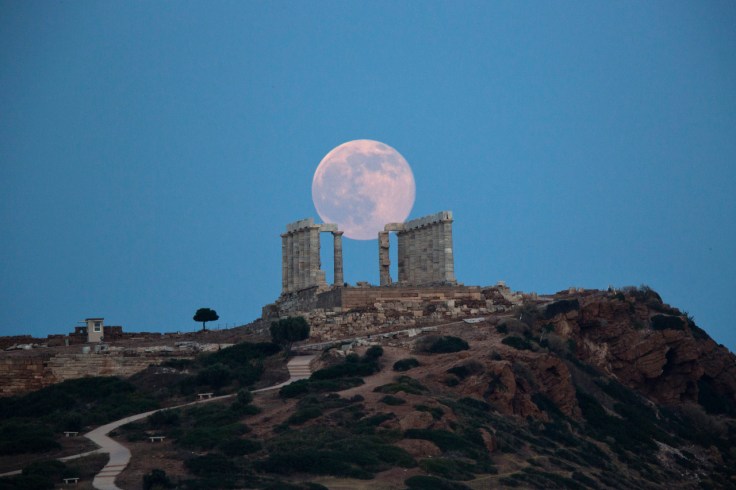 The full moon rises behind the columns of the ancient marble Temple of Poseidon at Cape Sounion, southeast of Athens, on the eve of the summer solstice on June 20, 2016. The temple located on a promontory at Cape Sounion, about 70km (45 miles) south-southeast of Athens, built 444 BC, and dedicated to Poseidon, god of the sea. (AP Photo/Petros Giannakouris).