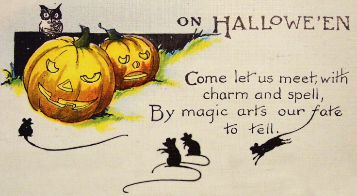 “Come let us meet, with charm and spell, by magic arts our fate to tell.” From a Hallowe’en postcard, date uncertain.