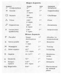 The next table contains the basic aspects that are used in astrology, included are their symbols, angular attributes and orbs (area of influence, in degrees), and their keyword concepts. Also included are some of the lesser aspects, which are also used, especially with transits and synastries.