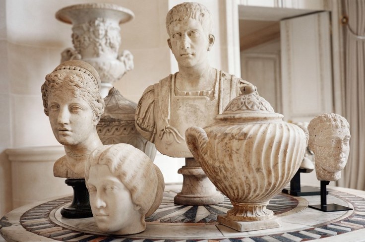 Greek and Roman sculptures atop a 16th-century table in the Santo Domingos’ Paris apartment, 2002.
