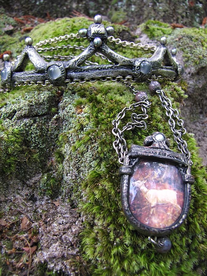 Antique silver + moonstone crown by Parrish Relics. Watherhouse white stag pendant by Parrish Relics